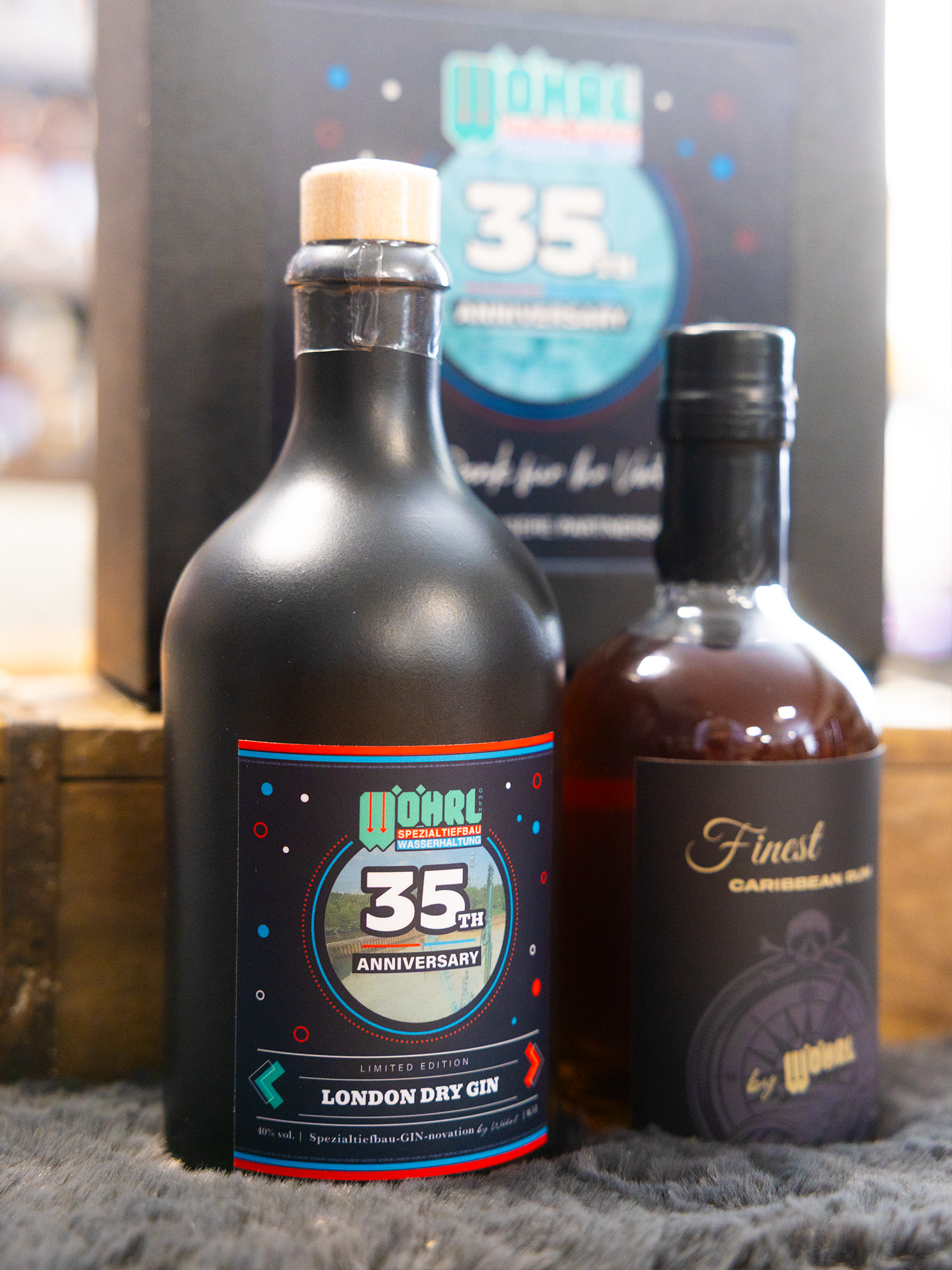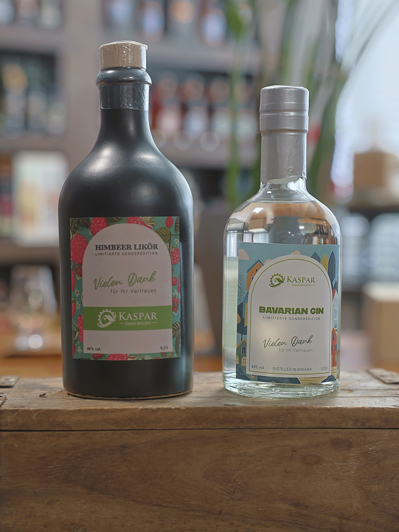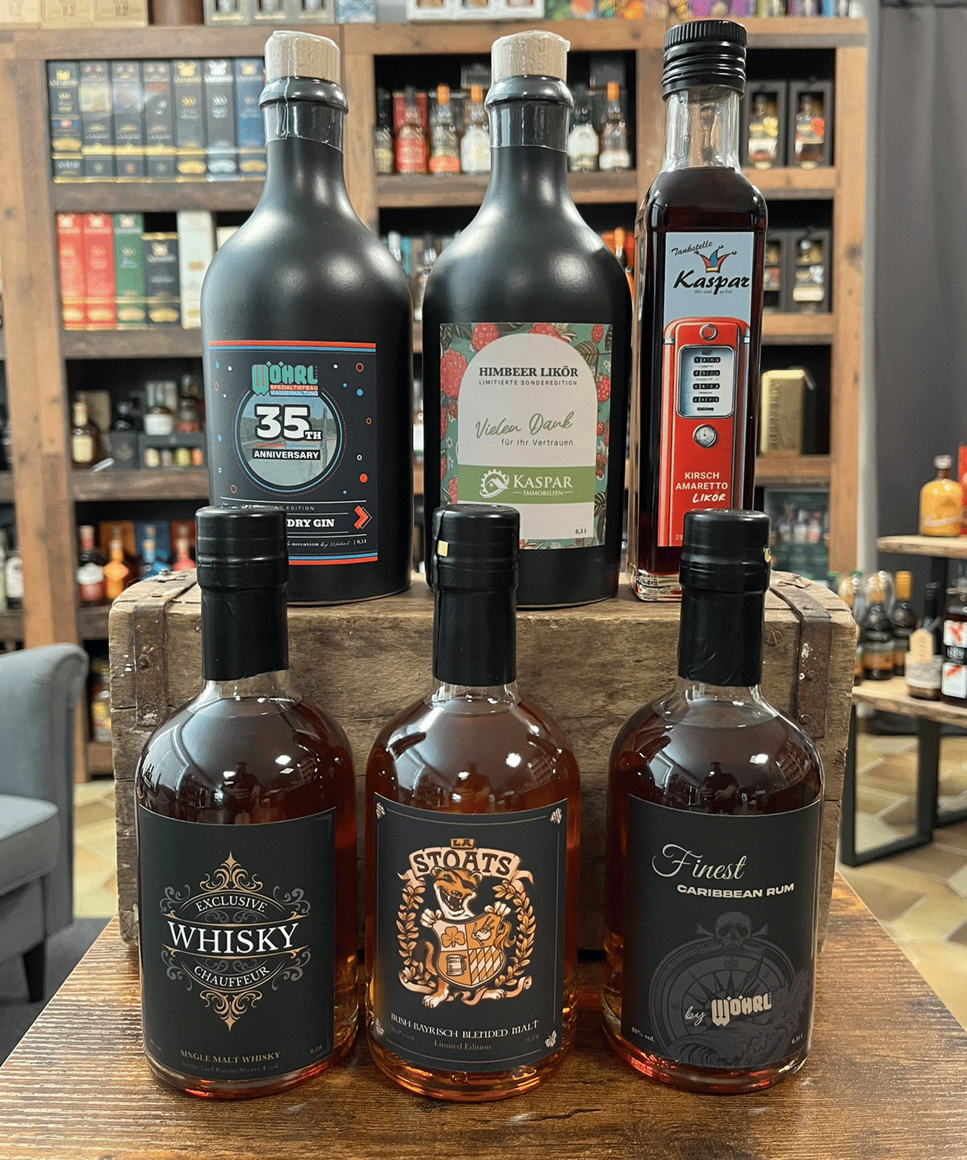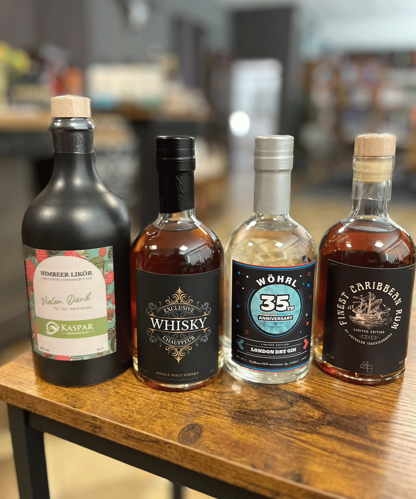 Eine Flasche mit Charakter – und eurem Namen drauf! Wir gestalten Etiketten ganz nach euren Wünschen: mit Logo, Firmenfarben, Grußbotschaft oder komplettem Rebranding. Ob 0,35l Whisky mit elegantem Etikett oder ein Gin mit Augenzwinkern fürs nächste Teamevent – bei uns wird aus jeder Flasche ein Unikat. Perfekt für Events, Kundenpräsente oder besondere Anlässe im Unternehmen.